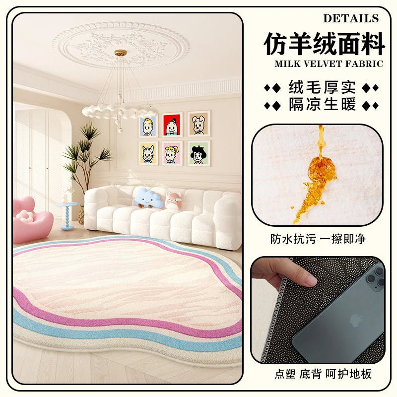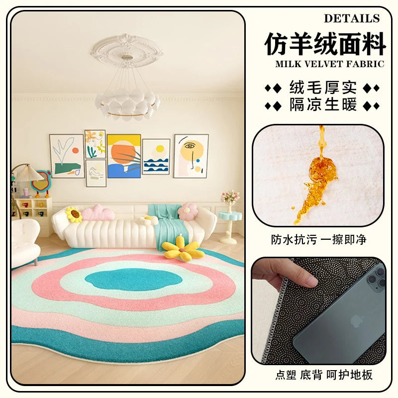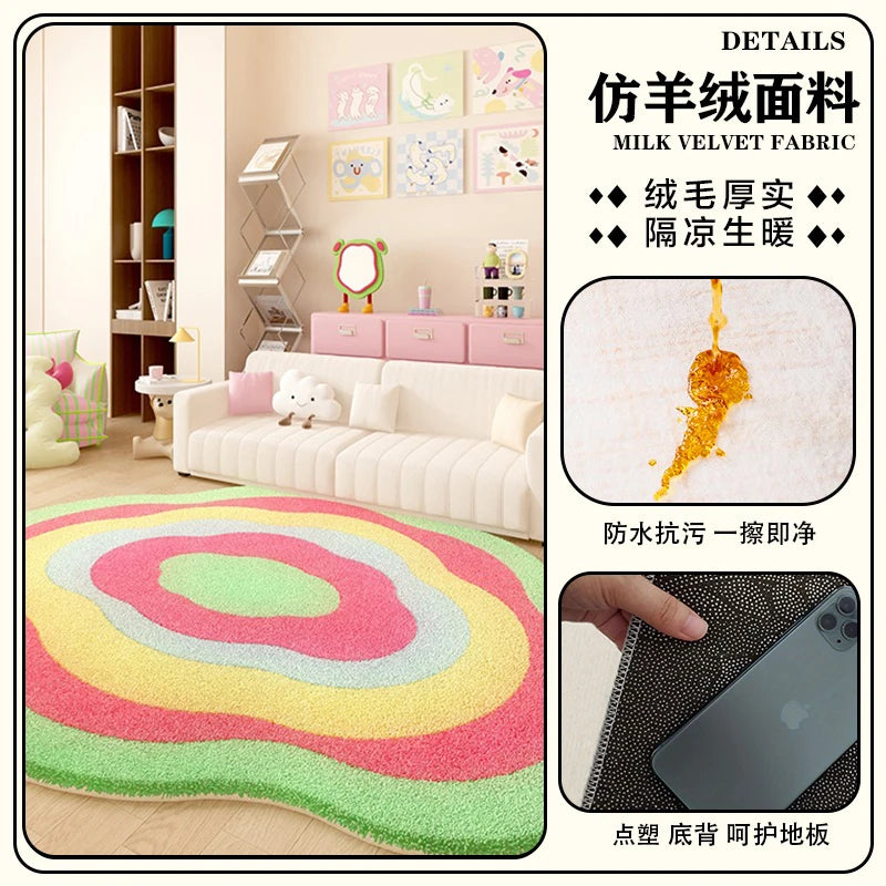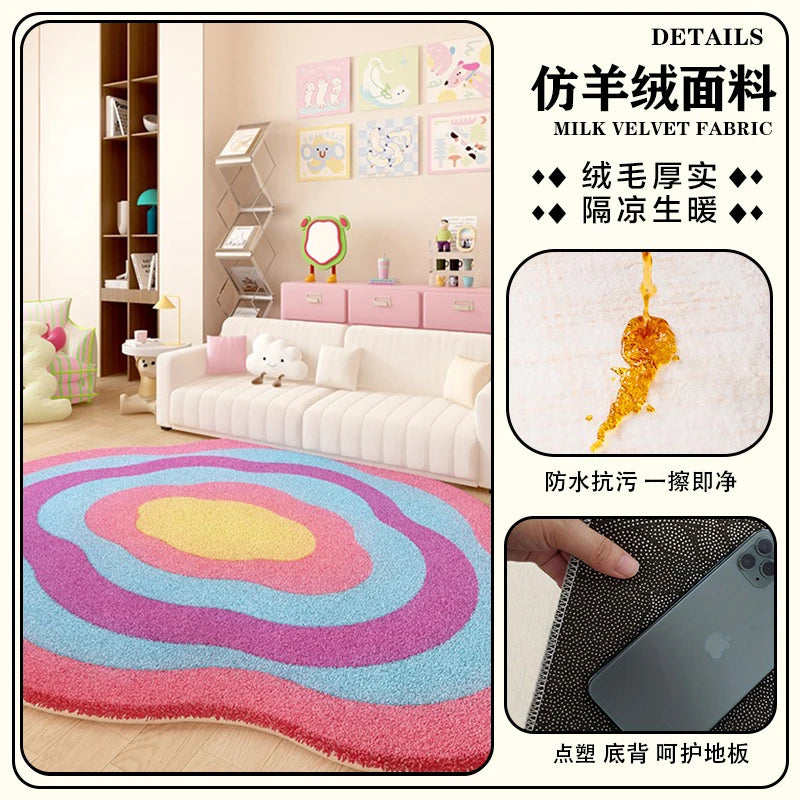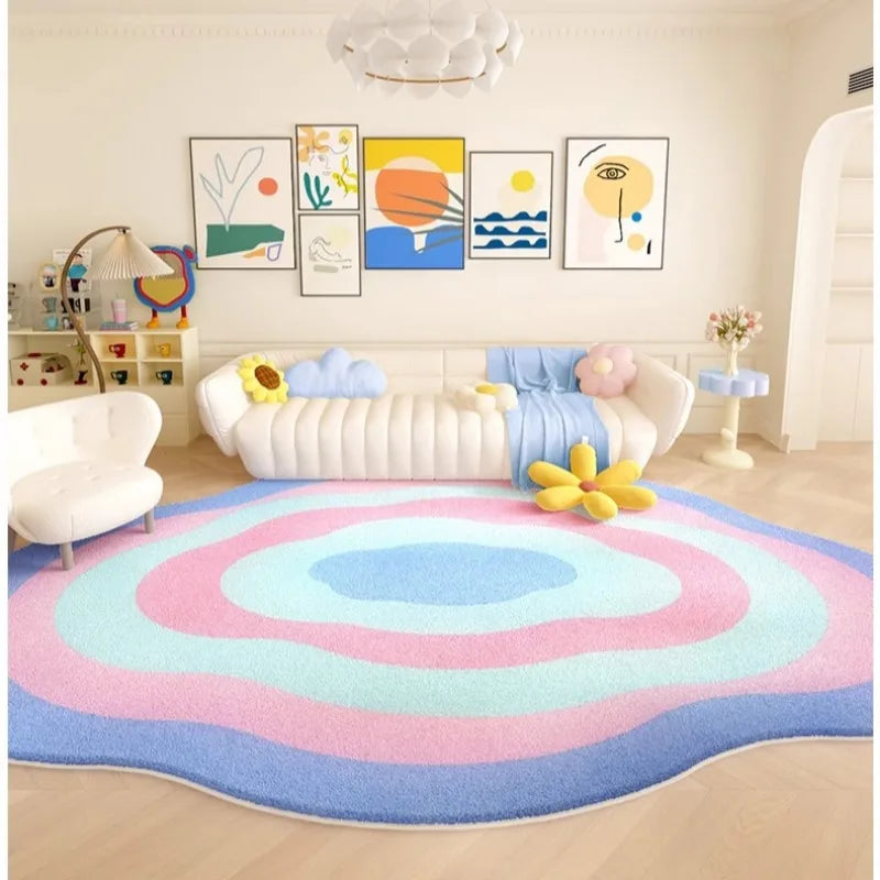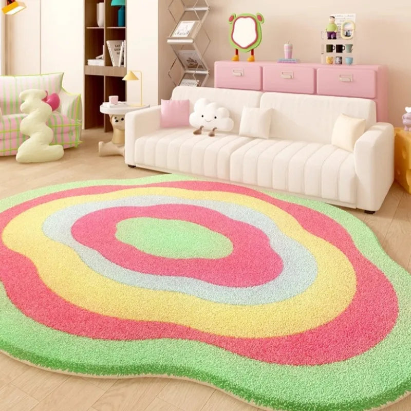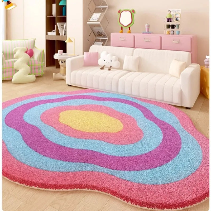 Ob Wohnzimmer, Schlafzimmer oder Kinderzimmer – dieser flauschige Teppich mit auffälligem Muster im Dopamin-Design ist ein echter Hingucker und schafft sofort gute Stimmung.